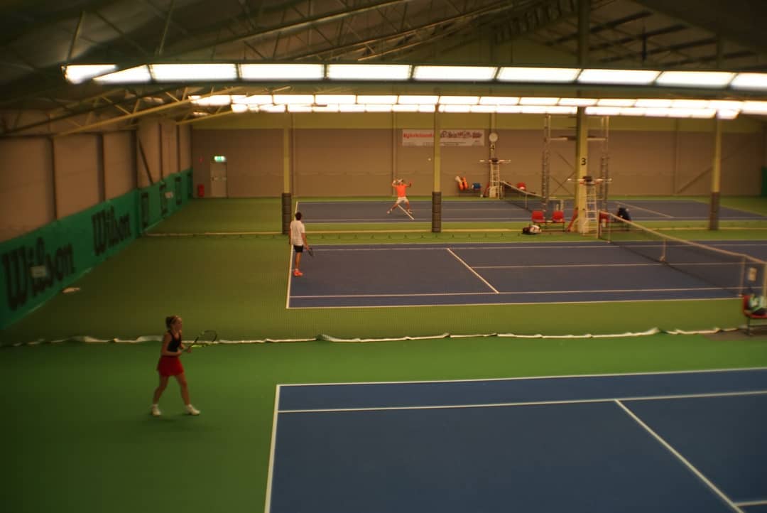 Tennishallen rymmer fyra banor, där bana 1 även kan användas för badminton, pickleball och pingis. Här finns en rymlig entré med caféhörna, soffor och TV, perfekt för att umgås före eller efter spelpasset.