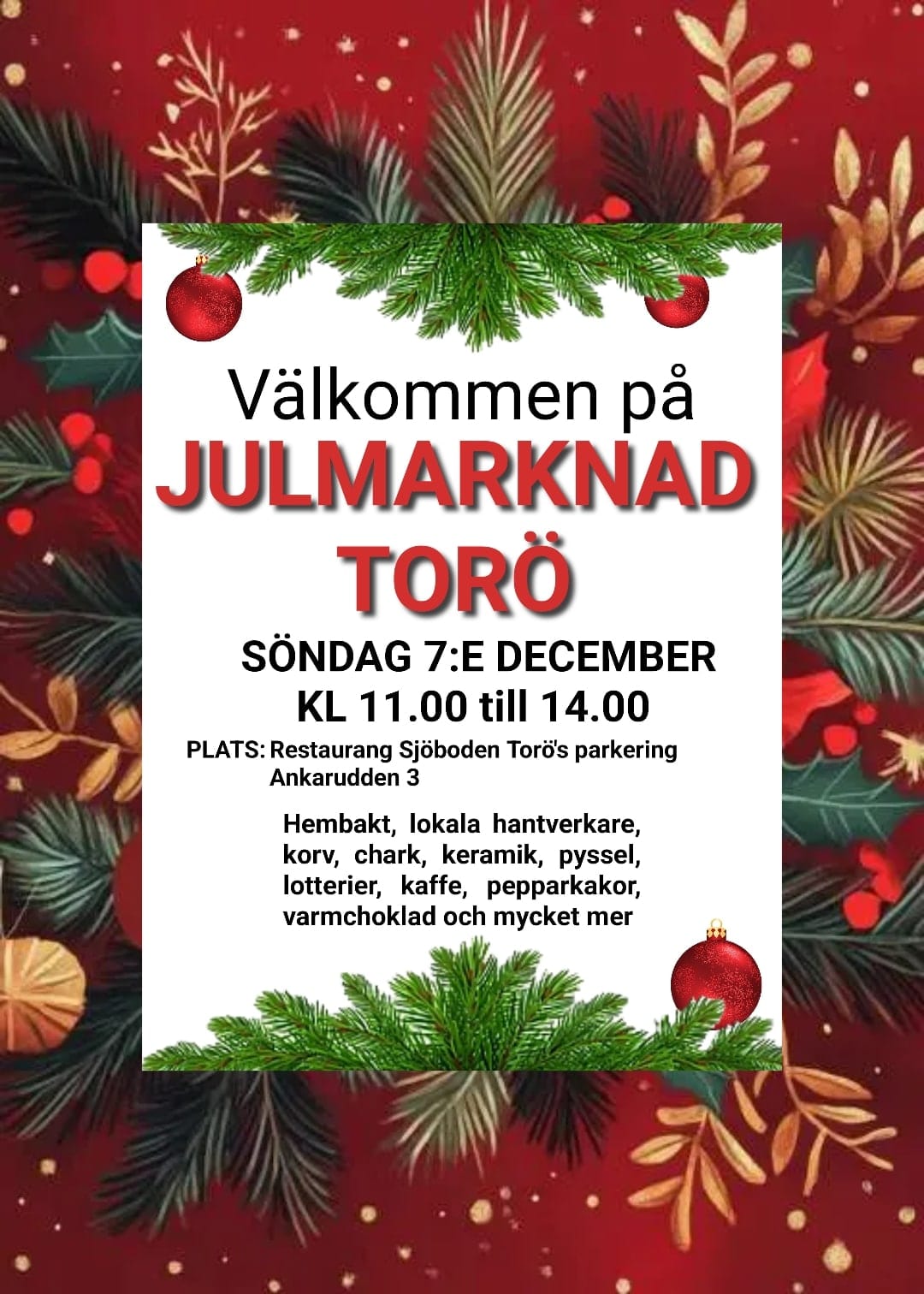 Välkommen till vår mysiga julmarknad på Ankarudden 3, där doften av pepparkakor, glögg och hav möts i en härlig julstämning!