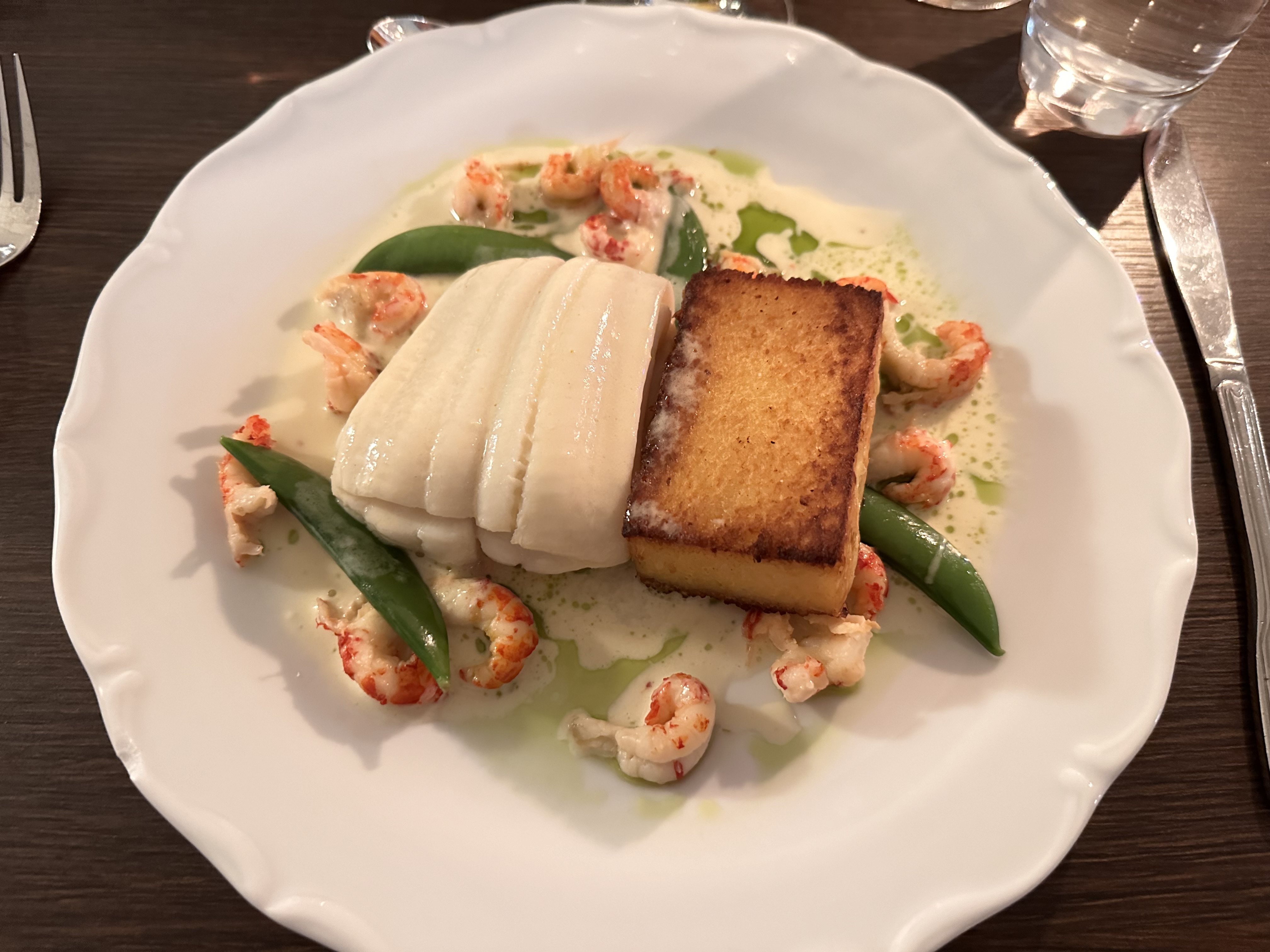 Färsk kolja med vitvinssås och räkor, kokt potatis